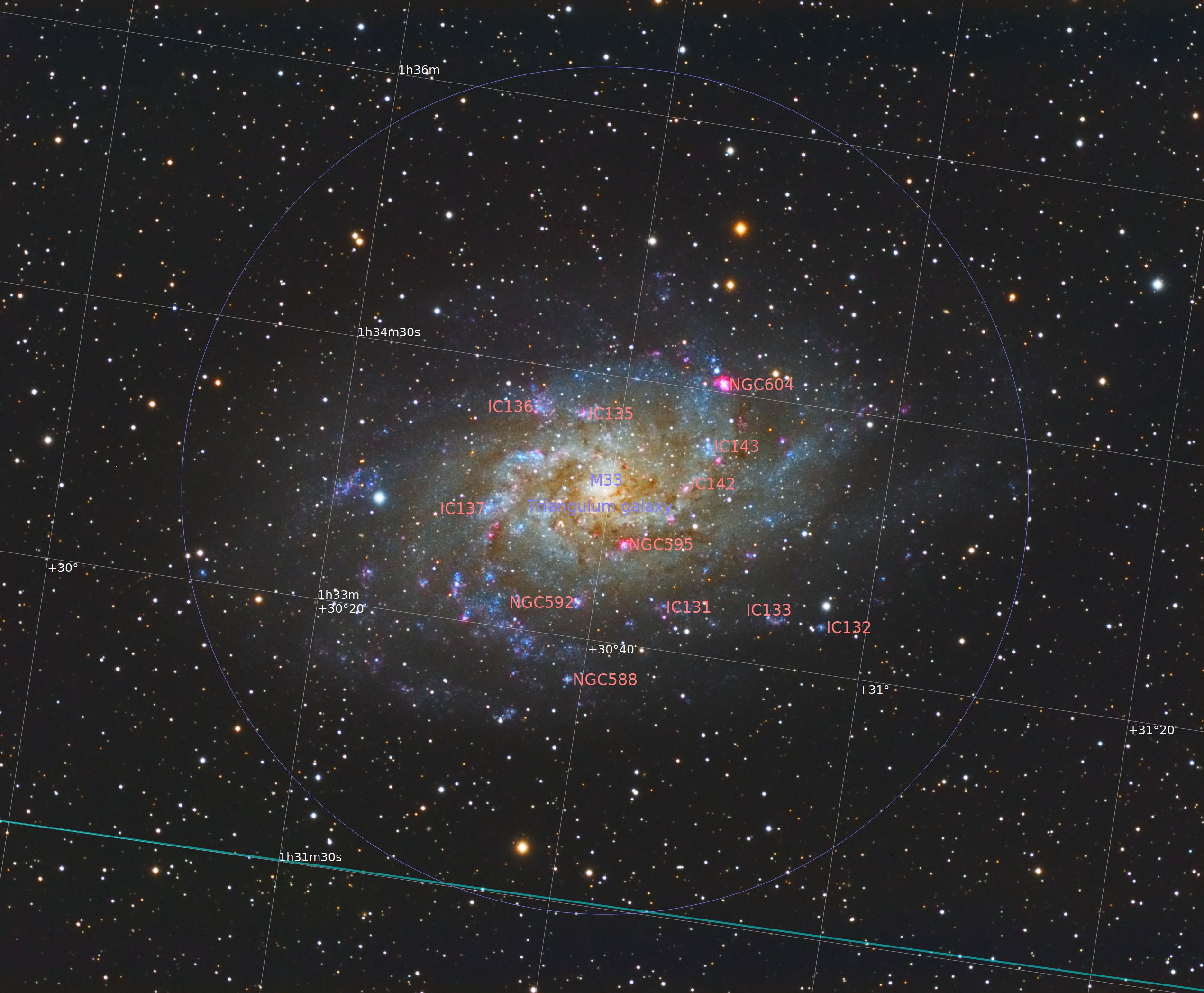 At a distance of about 2.8 - 3.0 million light years, M33 is the most distant object that can be viewed by the unaided eye and is visible in a dark sky setting as a very tenuous patch of light. Being a face-on galaxy, it has rather low surface brightness and it lacks a bright central core making it quite hard for beginners to find as they expect to see something much brighter and more colourful.