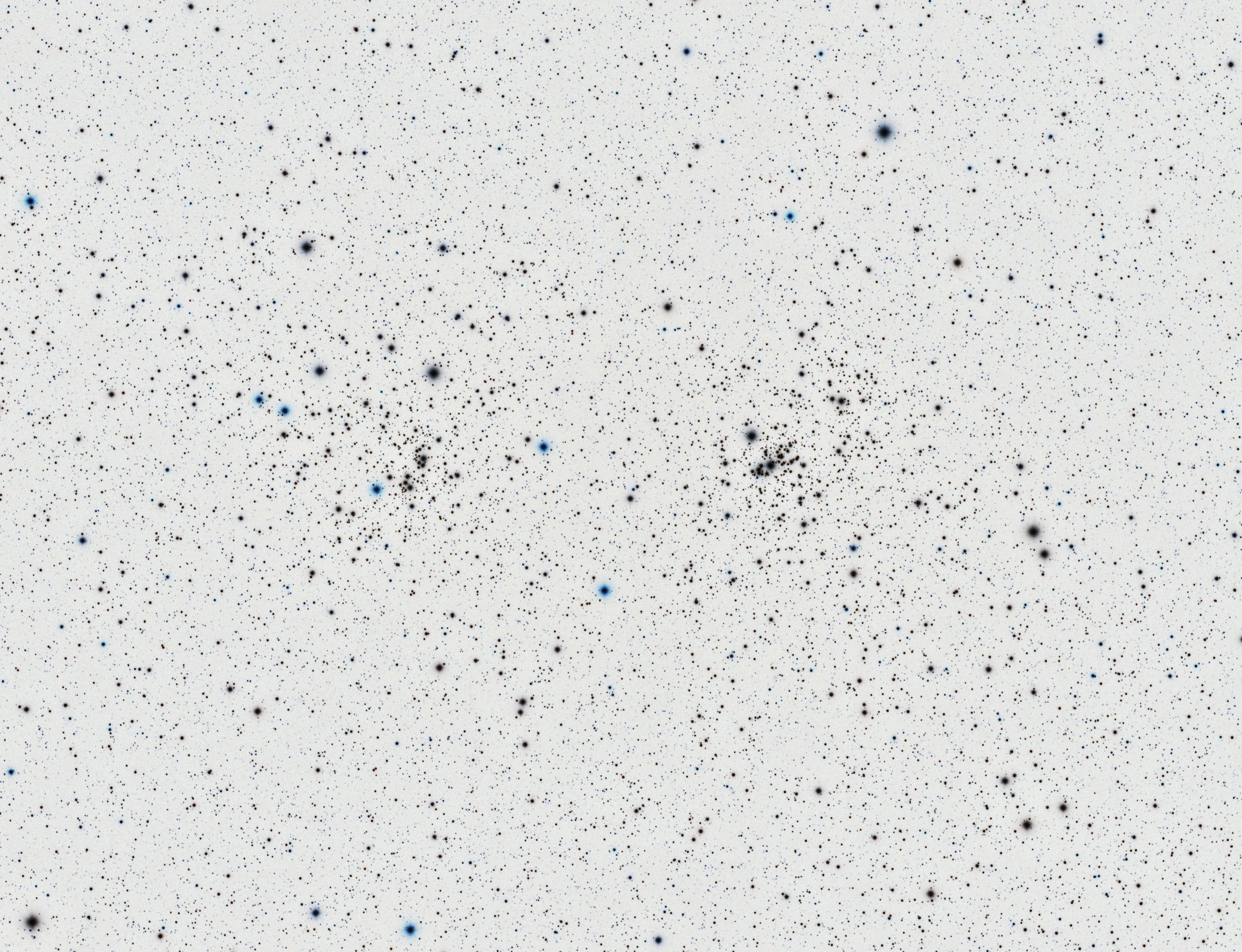 The Double Cluster is located in the constellation of Perseus, near the border with Cassiopeia and is composed of the two Open Clusters NGC869 and NGC 884. They are visible faintly to the naked eye on a dark night and a wide field eye piece shows them superbly in the telescope as does a pair of binoculars if you hold them steady.