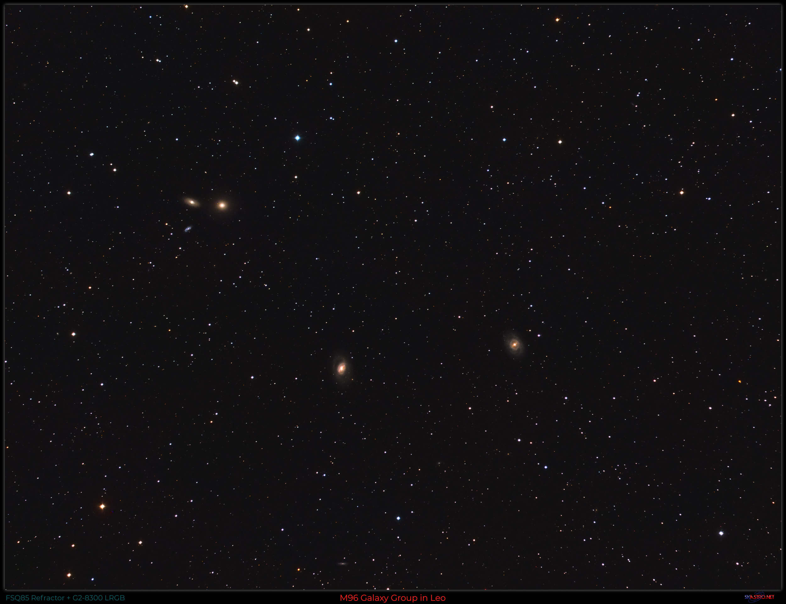 The M96 Group is a cluster of galaxies in the constellation of Leo. Not to be confused with the separate and arguably more famous Leo triplet. The M96 group contains three Messier galaxies (M95, M96 and M105) and many fainter galaxies in the background. The three main galaxies are about 35 million light years away and are easily visible in small telescopes.