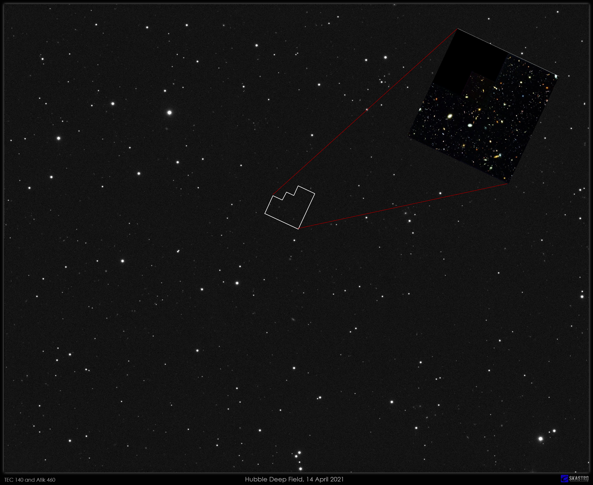 I took it on myself as a small project to image the Hubble Deep Field myself. Ursa Major and the HDF region is directly overhead at my location in Nottingham, UK in spring time. I downloaded the HDF coordinates from the Internet and used my TEC140 and Atik 460 CCD camera and captured 6 x 600s exposures with a luminance filter. There is no point in acquiring colour data for such remote objects. I used these to create this image: