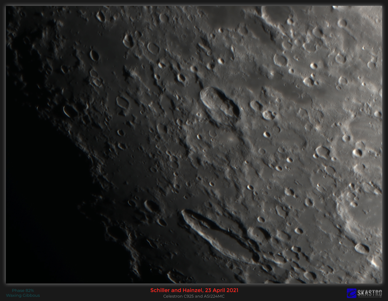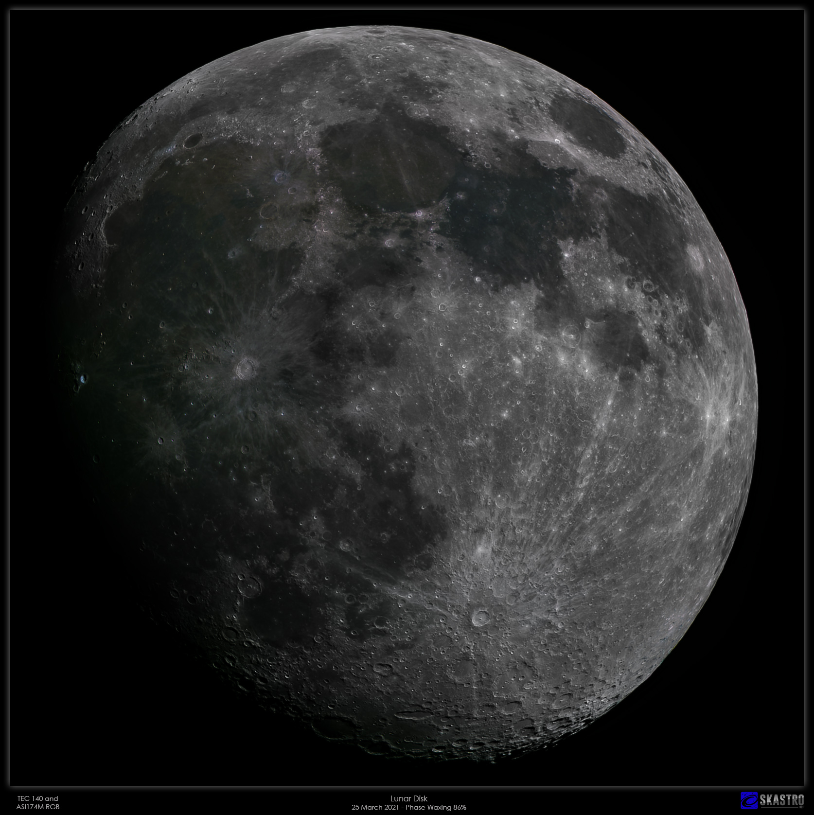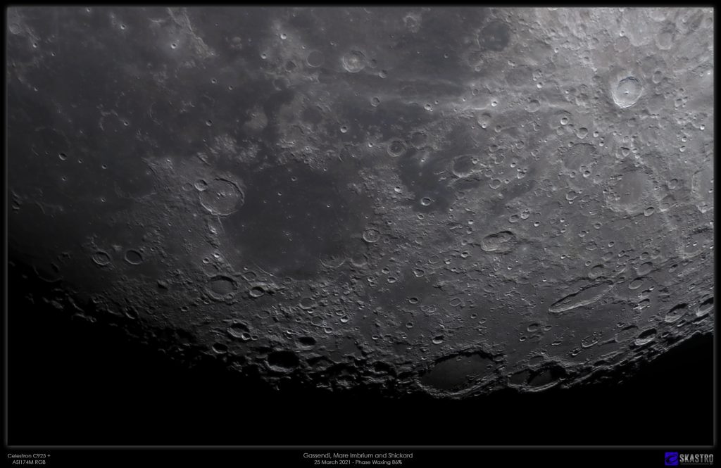 Images on this post were made by using the TEC140 and Celestron C925 SCT telescopes with my ASI174M mono camera. From my backyard in Nottingham on the evening of 25th March 2021 with the Moon high to the south in Leo at a phase of 86% waxing (i.e. growing towards full moon) and at an altitude of about 50 degrees above the horizon. A slightly hazy sky made for quite good seeing although it was very cold and windy and the moon was jiggling about a lot in the gusts, even inside my sheltered observatory. I had to try and time my capture runs between these gusts and passing clouds, a process that was not always successful. As a consequence I accumulated nearly 600G data for these four pictures in total, much of which had to be deleted. I was outside at the scope for about 90 minutes doing these captures.