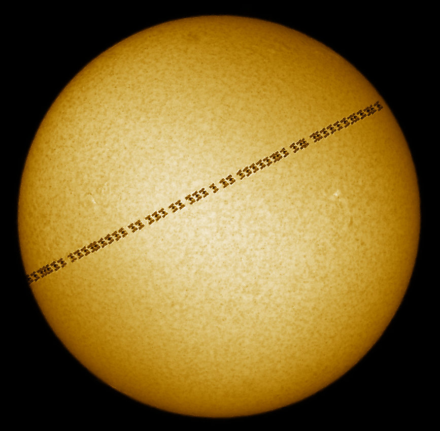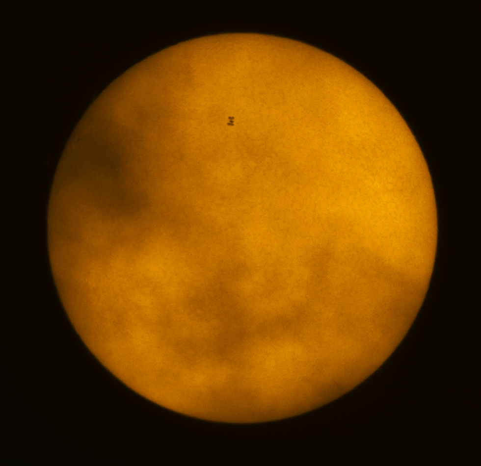 The transit above was not quite visible from my back yard and so I had to put all the gear into my car and drive about three miles from where I live. I set up about twenty minutes early to ensure I was ready and there were no technical gremlins. I was not quite located exactly where the ISS crossed the precise diameter of the sun - I was about 300m away! Yes, a very small change of position on the Earth's surface really does make that much difference to the visible track of the ISS across the face of the sun. The ISS was about 520km away when this sequence of images were taken.