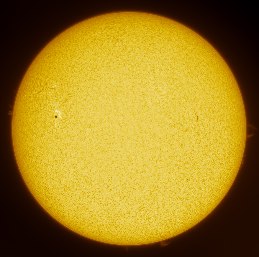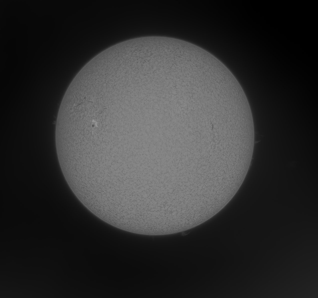 This is a 10000 frame capture of the Sun with good seeing at 13:10 UK time in Nottingham. I used my Lunt 60Tha and my ASI174MM camera at 16-bit and 65 fps. The day was very hot - by UK standards - at about 28C and quite humid. I was able to use 92% of the frames which I stacked in Autostakkert. Post processing in IMppg and Photoshop CC. The image capture is a full disk and disk and proms are from the same capture.