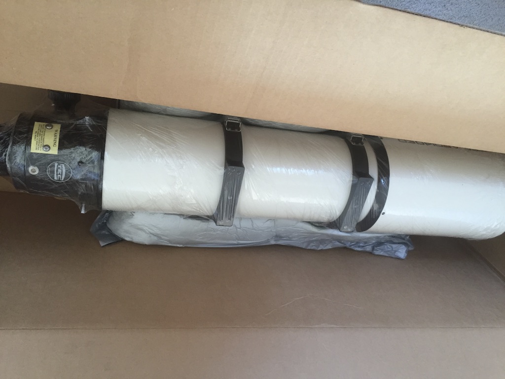 The scope is shipped in a strong and rigid cardboard carton with very strong and rigid styrofoam moulded to the shape of the scope to protect it. The scope inside is then wrapped and sealed in Polythene-like material with some desiccant to absorb any moisture. You could also specify your scope be provided (and shipped) in a permanent, hard exterior and felt lined shell storage case that you can purchase at the time of order. However, since my scope will be permanently mounted in my observatory I elected not to specific this option. The only option I chose upon ordering was to specify the Losmandy dovetail plate. I had no need of Yuri's finder (an option you can also specify) since I use my own red dot laser finder. (Update: As of 2023 - seven years later - my TEC140 has been permanently mounted and has never been outside my observatory).