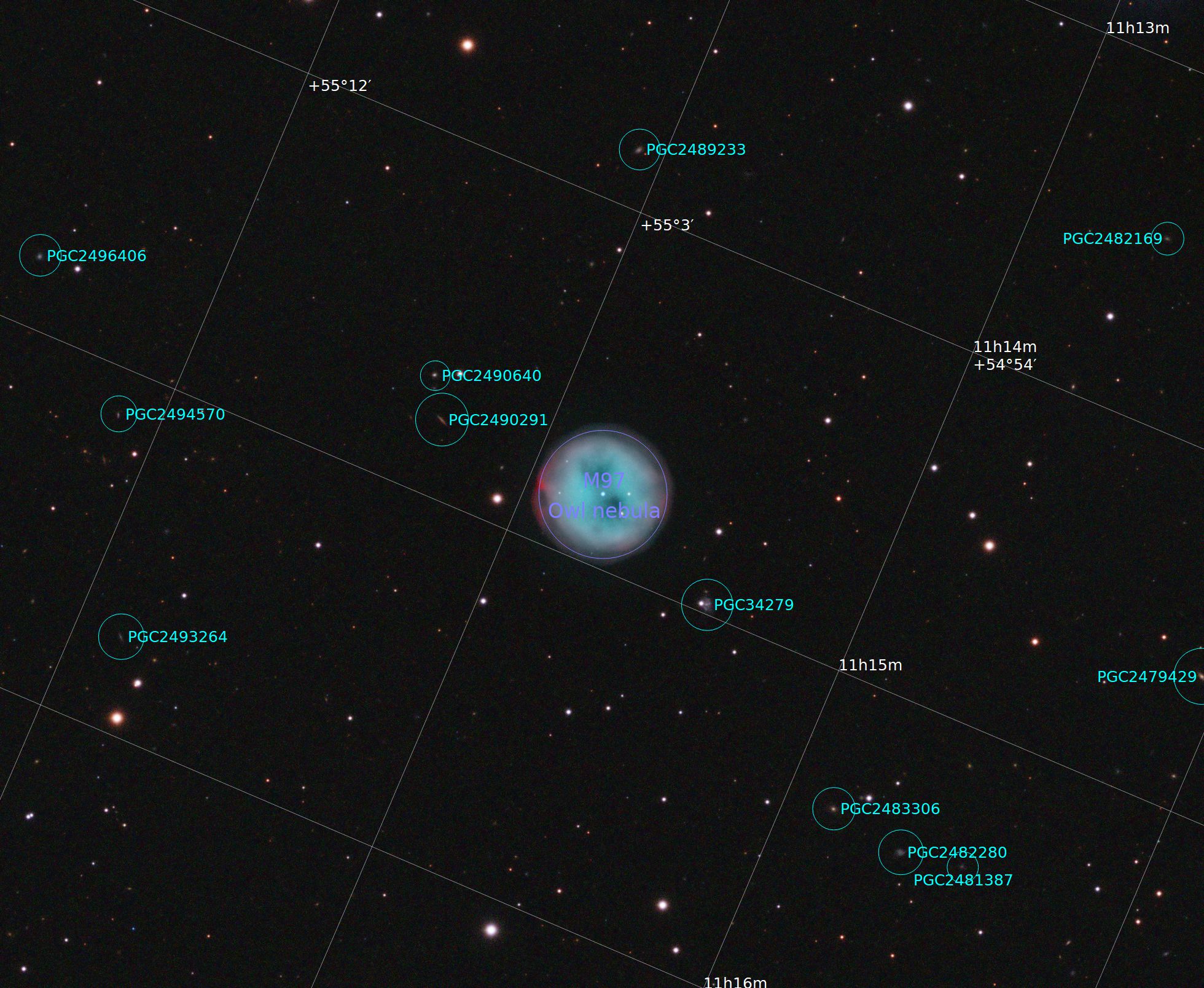 The annotated version above shows many distant galaxies in the same field of view as M97, although obviously these are very much more distant.